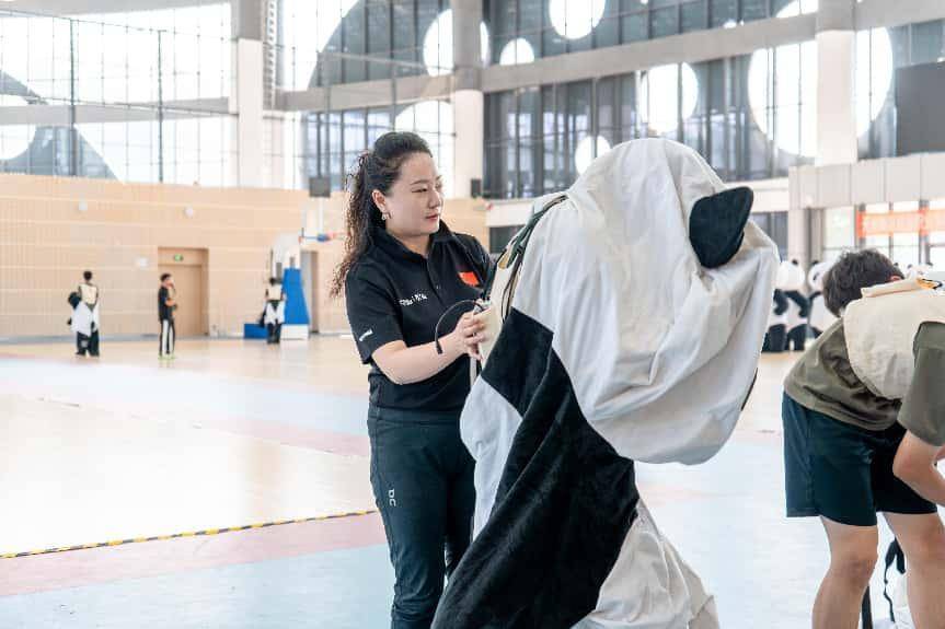 真正的挑战是从进场馆开始,整个7月同学们进场馆合练16次,每次上场都是一个多小时。在吉祥物人偶服里,不仅需要做出挥手、蹦跳等各种动作,还要忍受闷热的环境。穿着装冰袋的降温背心,把电池紧紧绑在身上防止掉落,很多同学都被捂出了痱子。整个暑假下来,团队里最少的瘦了5斤,最多的瘦了二十多斤。