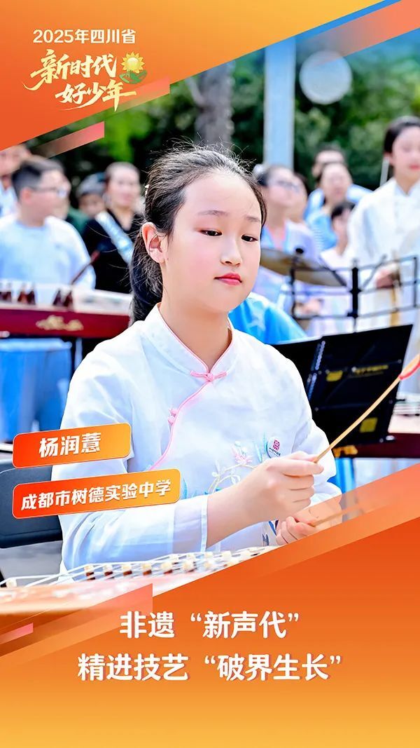 杨润薏,女,汉族,2011年11月生,成都市树德实验中学学生。她出生于非遗世家,在家庭的耳濡目染下,以传承四川扬琴、四川清音为使命,七年来坚持每天清晨训练两个小时,获得全国、省级等各类奖项50余项。她将家中珍藏的13台非遗大鼓捐赠给学校,带领更多的同学体验四川清音,在短视频平台开设“非遗技巧小课堂”,吸引网友观看。她立志要建一座非遗数字博物馆,用AI技术复原失传的《蜀宫夜宴》,向更多人推广非遗。她品学兼优,践行“学艺先做人”的家训。