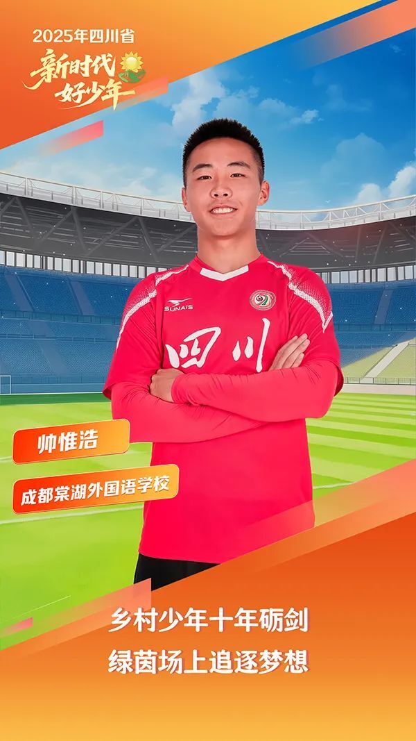 帅惟浩,男,汉族,2009年1月生,成都棠湖外国语学校学生。他的足球梦始于一所乡村小学,当时学校成立乡村足球队,他展现出了对足球超乎常人的天赋与热爱。十年来,他坚持每日训练,反复练习盘带、控球等基础动作,对每一个细节都精益求精。2020年,被选入成都足协培训中心,开始专业训练之路;2022年,凭借出色表现入选蓉城青训“希望之星”;2025年3月,16岁的他代表成都蓉城队在中乙联赛登场,成为首位在中国足球职业联赛中出场的“09后”球员,实现了赛场开门红。赛场外,他学习、训练两不误,成绩名列前茅,还积极参加公益活动,有强烈的集体荣誉感和团队合作精神。