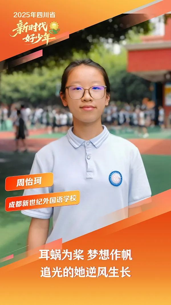 周怡珂,女,汉族,2010年12月生,成都新世纪外国语学校学生。她先天双耳失聪,一岁八个月时植入人工耳蜗,在康复老师的耐心教导下,从听见声音到逐步听懂声音。她学习认真刻苦,成绩名列前茅;她热心公益,积极参与街道、社区各类志愿服务活动,时常向社区捐赠图书。她品学兼优、全面发展,在四川地区青少年美育教育成果展中荣获金奖,取得速写十级证书、素描七级证书。她阳光开朗、热爱运动,在成都市第十届残疾人运动会羽毛球女子双打(听力残疾组)中斩获第二名。