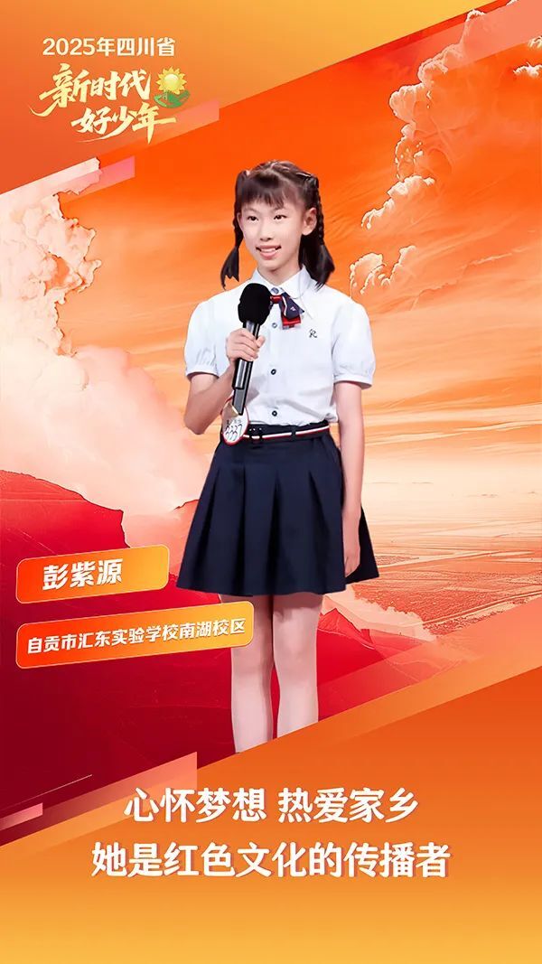 彭紫源,女,汉族,2013年8月生,自贡市汇东实验学校南湖校区学生。她投身公益,先后20余次深入乡村,为困难群众、留守老人送去生活物资;动员身边的同学、亲友筹集书籍200余册,捐赠给乡村孩子,丰富他们的课余生活,并为贫困学生辅导功课,分享自己的学习经验。她热爱家乡,主动报名成为红领巾讲解员,连续三年利用寒暑假参加“江姐故里”红色教育基地志愿服务,接待来访者1500余人。她传播红色文化,凭借“红岩精神 永放光芒”主题演讲,在四川省“新时代 蜀少年”红领巾讲解员比赛中获得一等奖。获得自贡市“2024年新时代好少年”称号。