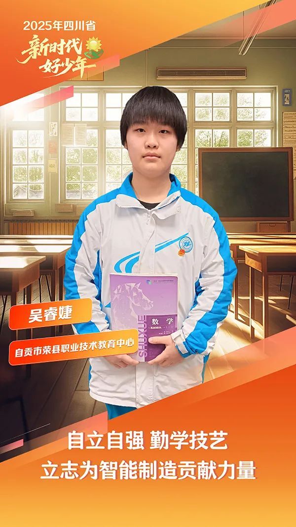 吴睿婕,女,汉族,2008年9月生,自贡市荣县职业技术教育中心学生。在钳工实训车间,她总是最早到、最晚走,从精准划线到锯削锉磨,反复练习每一个动作。课后,她刻苦钻研专业书籍、查阅资料、请教老师,一遍遍调整工艺参数,直到作品完美无瑕。在钳工、车工等技能大赛中,她秉持“精益求精,追求卓越”的工匠精神,凭借扎实的技艺和沉稳的心态屡获佳绩。生活中,她以孝为先,用稚嫩的肩膀扛起家庭重担,用实际行动诠释职教学生的自强风采。获得自贡市“2024年新时代好少年”称号。