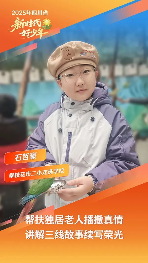 石哲豪,男,汉族,2014年2月生,攀枝花市二小龙珠学校学生。多年来,他和父母一起关心帮助独居老人郭婆婆,捡拾柴火、打扫卫生、照顾生活,还拿出他的压岁钱购置生活用品,让郭婆婆感受到家的温暖。他积极参加攀枝花中国三线建设博物馆义务讲解、社区慈善义卖、志愿服务等公益活动,捐赠稿费等累计2000余元,用于防范地质灾害、帮助困难群众等。他兴趣爱好广泛,在计算机编程、无人机、机器人等课外科技项目中均获奖项。