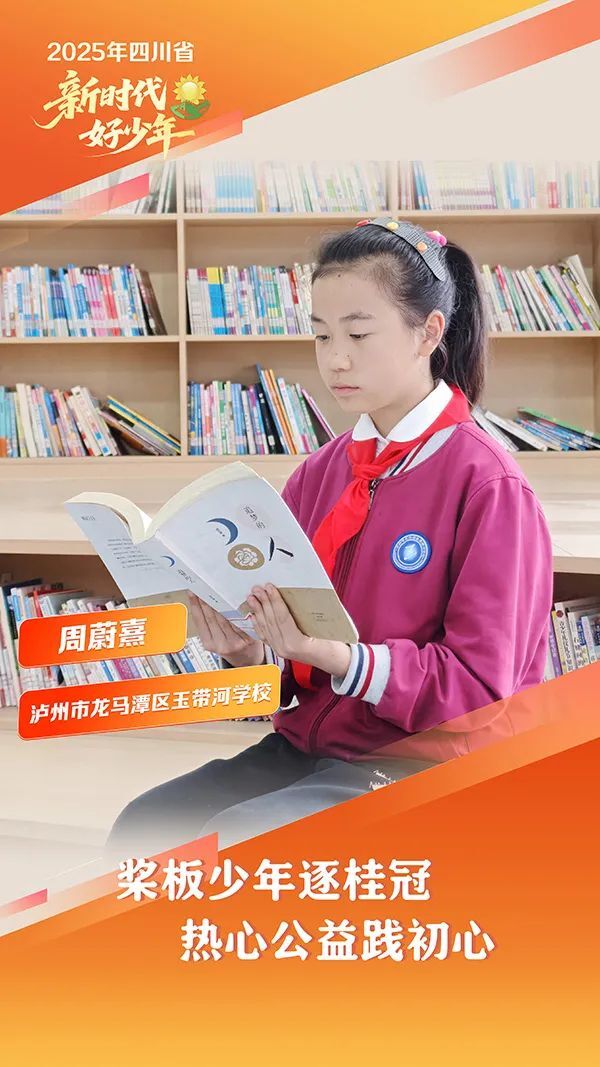 周蔚熹,女,汉族,2013年5月生,泸州市龙马潭区玉带河学校学生。她创建“蔚熹公益课堂”,组织“古诗词公益讲座”走进七所乡村学校,并自费购买300册图书捐赠给学校,为乡村学生打开了学习古诗词的大门。在“美丽中国・川娃在行动”环保项目中,她带领调研小组连续30天记录社区垃圾数据,经过深入分析形成方案,纳入社区改造计划。获得全国桨板U12组4站冠军、省级“蜀风诗韵”诗词大会奖项等。