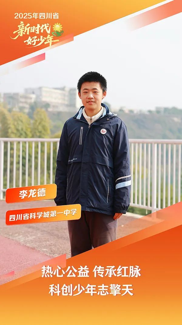李龙德,男,汉族,2009年11月生,四川省科学城第一中学学生。他在中国工程物理研究院科研报国的浓厚氛围中成长,立志勇攀科学高峰。他发起组建“国学晨读角”带领同学研读经典,担任“两弹城”小小讲解员,积极传播“两弹一星”精神。他勤奋自律,白天钻研数理竞赛,夜晚解析英文论文,反复练习模拟演讲,最终斩获西安交通大学少年班资格,成为2025年四川省唯一入选的初中生。他主动策划“智慧助老”项目,设计《智能手机使用图解手册》,用数字技术赋能社会服务。