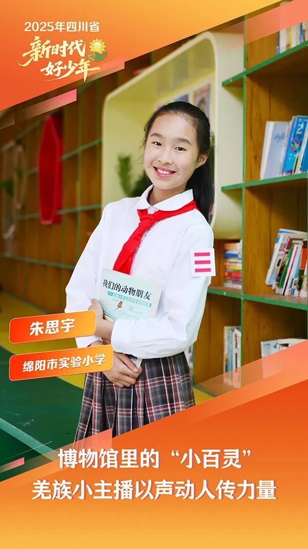 朱思宇,女,羌族,2012年8月生,绵阳市实验小学学生。她积极争做最美志愿者,用博物馆历史长廊上百余场的生动讲解,担当中华优秀传统文化传播者,被授予“全国文旅宣传使者”称号。她坚守红领巾宣讲台,传承红色基因,以《延安,我把你追寻》的精彩演绎,摘得全国“人教杯”诵读活动“诵读之星”称号。她自强奋进,青春赛道展风华,获得全国青少年爱国主义读书教育活动特等奖、四川省红领巾讲解员大赛市级一等奖。