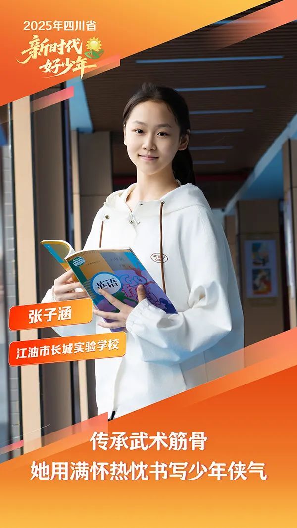 张子涵,女,汉族,2010年9月生,江油市长城实验学校学生。她是国家二级运动员,以“文武兼修”为人生信条,在学业与武术领域取得双优成绩。她是学校武术队骨干,累计斩获28枚武术赛事奖牌(含全国金牌3枚、省级金牌12枚)。作为学校武术社团负责人,带领团队蝉联两届绵阳市青少年武术团体冠军;“星火杯”2024年四川省青少年锦标赛中,与队友勇夺13金13银7铜。2025年,她化身“哪吒”形象参与江油马拉松,以武术展演宣传本土文化,成为赛场上一道亮丽风景。