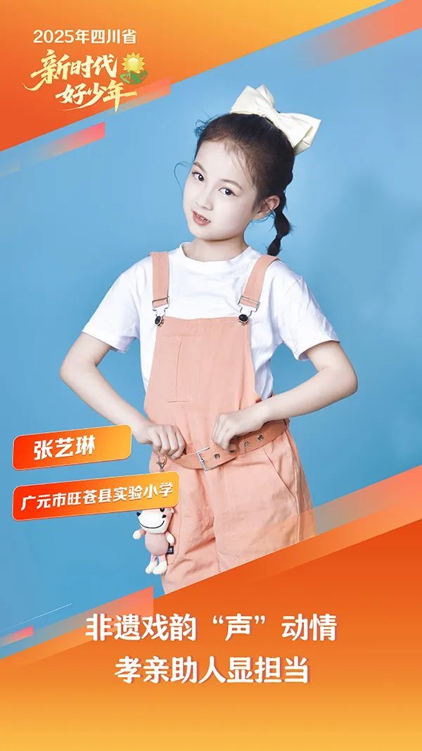 张艺琳,女,汉族,2015年8月生,广元市旺苍县实验小学学生。她以传承红色基因、弘扬红军精神为使命,2021年起,在中国红军城纪念馆开展义务讲解,累计撰写讲稿笔记2万余字。她将非遗“端公戏”创新融入红色故事,生动再现革命历史,在四川省“红领巾讲解员”川东北片区交流展示活动中斩获三等奖。面对家庭困境,她悉心照料罹患尿毒症的父亲,坚持参与公益活动200余次,用阳光温暖他人。她学业成绩稳居年级前列,创建“学习互助小组”和“阳光运动打卡计划”帮助50余名同学。多领域展现卓越才能,获得省级舞蹈及钢琴比赛多个奖项,主持6场市级少儿春晚,保持校运会女子百米纪录。