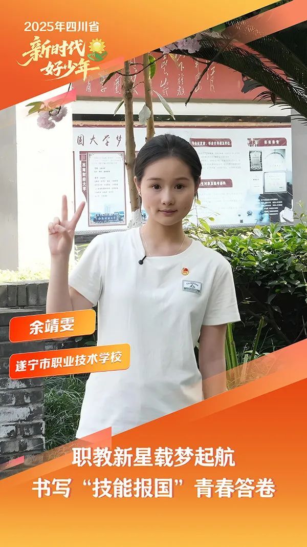 余靖雯,女,汉族,2008年4月生,遂宁市职业技术学校学生。身为共青团员,她积极参与党的二十大精神学习宣讲活动,牵头组织“职教生技能报国”主题演讲、“红色经典诵读”等活动,用青年声音传递信仰力量。她深耕电子商务领域,课堂内外皆见其勤勉身影,走进偏远乡村开展公益直播;专业成绩连续三年稳居前列,撰写了2万余字直播运营笔记,创新“场景化话术”“数据驱动选品”等实战技巧。在市级中职电子商务技能大赛中,连续两年获得一等奖;在2024川渝毗邻地区教育体育(遂宁)博览会上,她被组委会授予“最具潜力主播”称号。