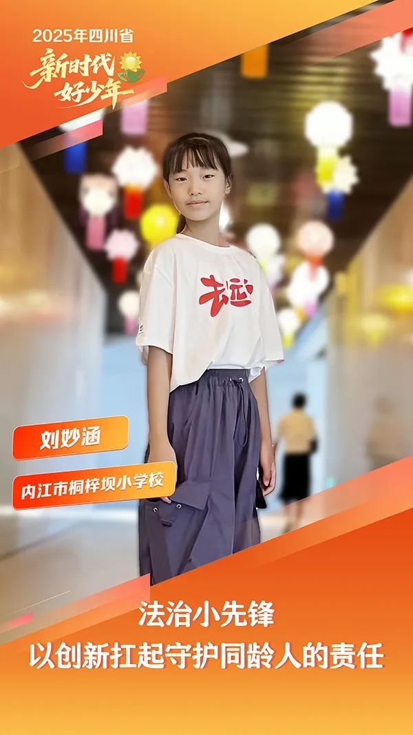 刘妙涵,女,汉族,2013年3月生,内江市桐梓坝小学校学生。她带领团队策划趣味法治游戏,用四川方言编写《校园安全三句半》。牵头研发“智能图书漂流柜”,使校园图书月流通量激增。作为学校机器人战队队长,她带队参加内江市学生信息素养大赛无人机普及赛并夺冠。她心怀正义,以稚嫩双肩扛起守护同龄人的责任,连续三年帮扶听障同学,设计“振动提醒手环”,用科技搭建无声世界的桥梁。