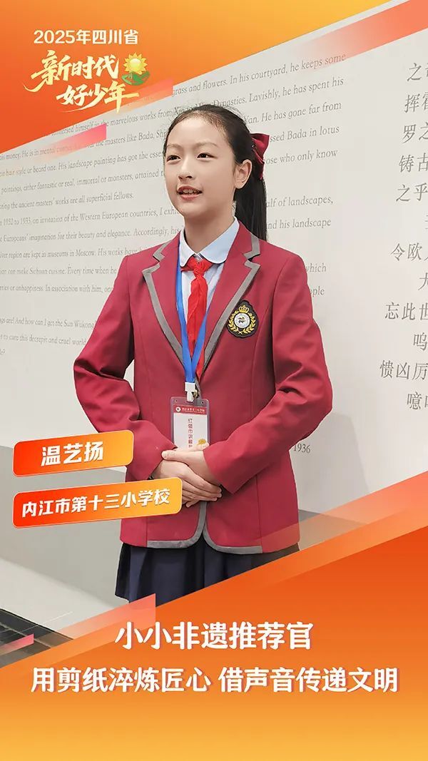 温艺扬,女,汉族,2013年7月生,内江市第十三小学校学生。七岁起,她师从内江非遗传承人李有生,开始学习剪纸,每日课后坚持训练,指尖磨出茧痕,她笑称为“非遗勋章”。2024年,她受邀担任内江电视台公益非遗推荐官,参与拍摄的视频以灵动的手工技艺与青春视角诠释了非遗魅力。她在张大千博物馆开展讲解服务数十场次,让游客见证了书画与诗词的千年共鸣。作为中队长,她学习成绩优异,综合素质测评全优,创建“学习互助圈”带动同学成绩提升。