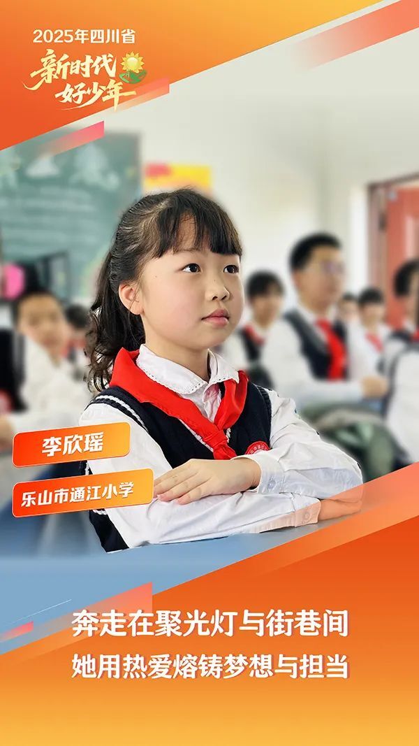 李欣瑶,女,汉族,2014年6月生,乐山市通江小学学生。她五岁时与街舞结缘,每天练习,不惧伤痛,以超乎常人的毅力踏上逐梦之路,4次登上央视舞台,在《黄金100秒》《非常6+1》等节目中都有精彩表现。数次受邀到浙江卫视、贵州卫视等参与节目录制,是拥有40余万抖音粉丝的“街舞小明星”。她勤学善思,独创“三维学习法”获学校推广。她热心环保,发起“变废为宝”创意行动,被誉为“环保小卫士”。她主动关心家人,参与家务劳动,是家人眼中的“贴心小棉袄”。