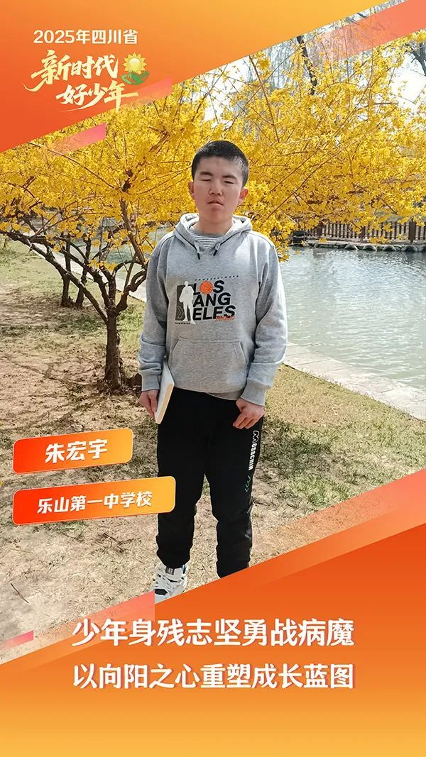 朱宏宇,男,汉族,2008年11月生,乐山第一中学校学生。他自幼罹患双眼葡萄膜炎继发性失明、左眼后发性白内障、右眼球萎缩、双膝关节滑膜炎、双手拇指畸形等病症,从小辗转于多家医院,历经多次大手术,但病魔终未将他击垮。他身残志坚,从未放弃求学之路,摸索出一套独特的“听记学习法”,以高倍望远镜和放大镜辅助学习,成绩稳居年级前列,凭实力进入学校强基计划“数学班”,最终以高分考入理想的高中。