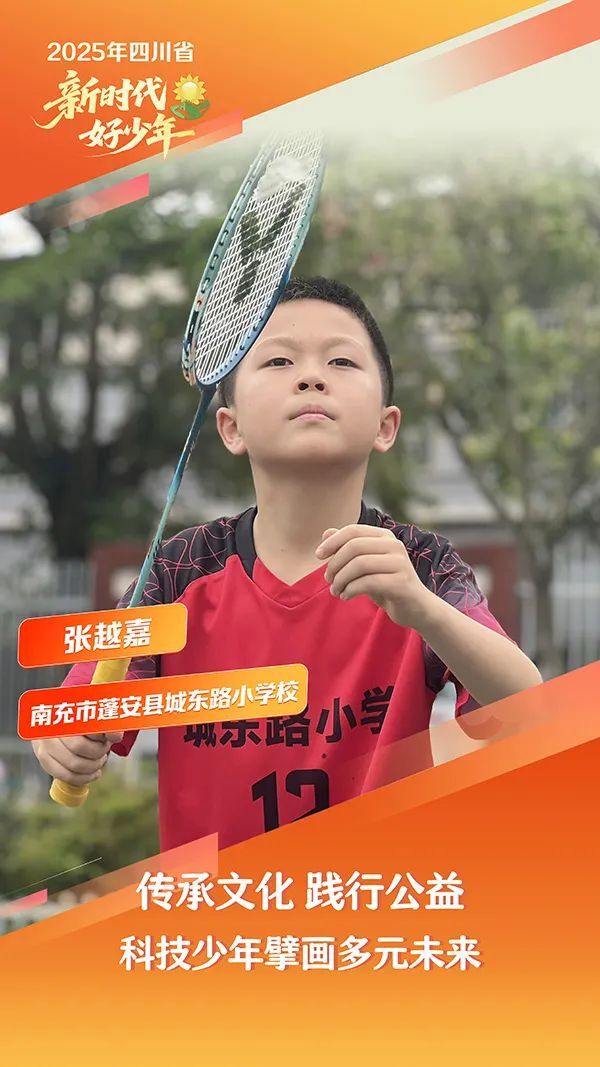 张越嘉,男,汉族,2013年11月生,南充市蓬安县城东路小学校学生。他以科技赋能、文化传承、公益实践,生动诠释着新时代少年的精神风貌。以“自强不息”为信念,争做学习典范,开发“AI护眼大师”软件。以“传承文化”为追求,在国际文化交流活动中,用英语自信讲述袁隆平等科学家的故事,展现当代少年的文化自信。组建“环保小卫士”志愿服务团队,当选校“红领巾志愿者协会”会长,组织20余次志愿服务活动。