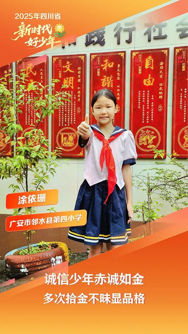 涂依珊,女,汉族,2014年2月生,广安市邻水县第四小学学生。她是学校篮球队队长,担任学校大队委委员。她是2024年9月邻水县电视台新闻报道——“邻水一名五年级学生捡到价值5万元的金项链,拾金不昧归还原主”的主人翁。她在学校上下学途中、宴会等场合,都曾捡到他人财物并及时交还,用自己的一言一行诠释了诚信美德。