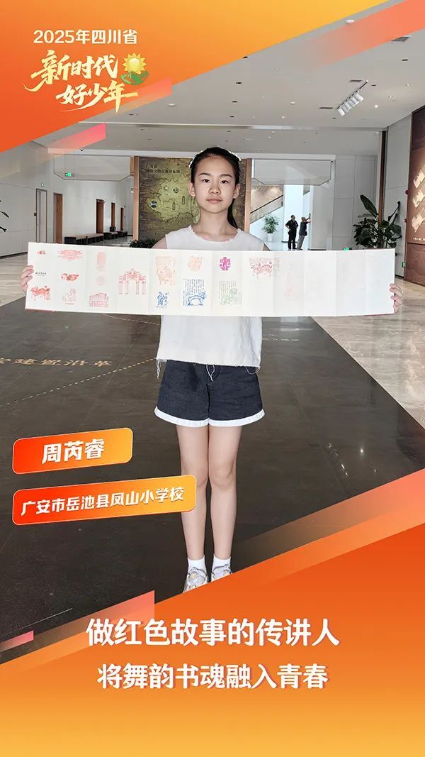 周芮睿,女,汉族,2014年10月生,广安市岳池县凤山小学校学生。她孝老爱亲,悉心照料病重奶奶;团结友善,带动班级帮扶结对小学。她勤奋好学,各科全优,硬笔书法六级、拉丁舞六级,多次在大赛中折桂。身为邓小平故里红领巾讲解员,她义务宣讲红色故事,视频《祖国有我》被“学习强国”转载,还在景区担任义务导游,推介广安“红绿交织”魅力,用行动绘就多彩青春。她连续五年担任班长兼校少先队大队委,以责任与担当诠释新时代少年内涵。