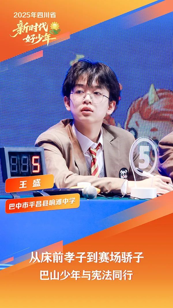 王盛,男,汉族,2009年7月生,巴中市平昌县响滩中学学生。为备战第八届全国学生“学宪法讲宪法”比赛,他废寝忘食,挑灯夜战,凭借锲而不舍的精神,在竞赛中脱颖而出,荣获全国一等奖。自入学起,他凭着扎实的学习功底,成绩始终在班级名列前茅。他心怀热忱,主动为学习上有困难的同学答疑解惑,是同学们学习的好榜样。在家里,他悉心照料生病的父亲,为母亲分担家务,成为小小“顶梁柱”,赢得邻里称赞。