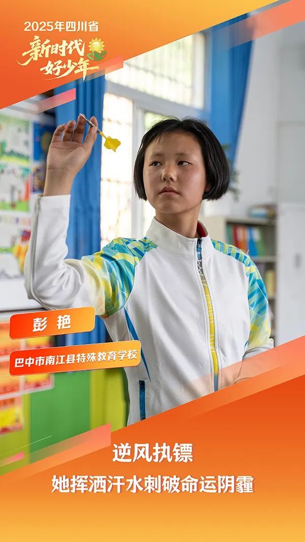 彭艳,女,汉族,2011年5月生,巴中市南江县特殊教育学校学生。2023年四川省残运会上,她凭着每天4000次飞镖训练的积累,以精准“红心”绝杀夺冠。荣耀的背后,是三年如一日的坚持。三年集训期间,她累计投镖26万次,磨破3双运动鞋,损坏47枚镖针,共摘得5枚省、市级金牌。作为班级里的“小太阳”,她清晨第一个到校为班级打扫卫生,还带领学校舞蹈团参加县艺术节。她以“无声的舞步踏出时代节拍”,用自强精神绽放出绚烂的生命之花。