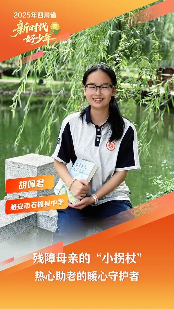 胡佩君,女,汉族,2008年12月生,雅安市石棉县中学学生。她是妈妈的“小拐杖”,右腿残疾的妈妈从未让胡佩君心中种下自卑的种子,反而让她深深地理解着父母的不易,主动承担起家里的家务活,耐心照顾着妈妈。她不仅对亲人尽职尽责,还关爱困境中的残障人士,带领同学走进敬老院,为老人们表演节目。2023年,她为被困暴风雨中的老爷爷撑伞的善举被报道,在网络上广泛传播,市民纷纷点赞。她用自己平凡朴实的行动,诠释了尊老爱亲的传统美德。她曾获“雅安市优秀少先队员”等称号。