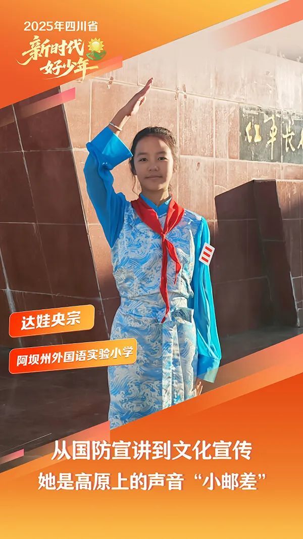 达娃央宗,女,藏族,2014年2月生,阿坝州外国语实验小学学生。她担任学校学生干部,以爱国爱校、自强自立的精神,代表全州参加四川省国防教育宣讲比赛并获奖;她利用假期在州博物馆做志愿者,宣传民族文化。她品学兼优,全面发展,不仅学业优异,还在舞蹈、唱歌、主持等多方面屡获佳绩。生活中,她尊老爱幼、乖巧懂事,是家人的“开心果”,也是邻里眼中的好孩子。荣获四川省中小学师生“用英语讲好中国故事”比赛特等奖,并获评为阿坝州优秀少先队员。