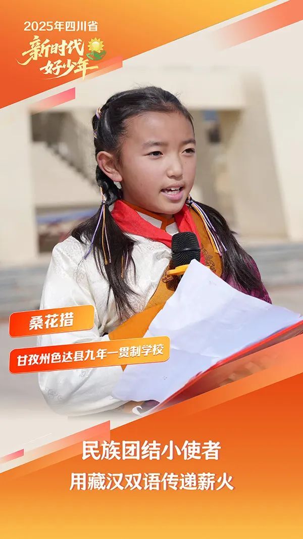 桑花措,女,藏族,2014年5月生,甘孜州色达县九年一贯制学校学生。她创新“故事+情景表演”形式,再现红军长征途经色达时与藏族同胞的感人故事。她代表色达县参加甘孜州“民族团结在我心”演讲比赛并获优秀奖,入选甘孜州“星火宣讲团”。她成立“高原书社”激发同学阅读兴趣。学校每天午间的“红领巾广播站”,她坚持用藏汉双语播报,开创“民族团结小课堂”等特色栏目,累计广播节目180余期。